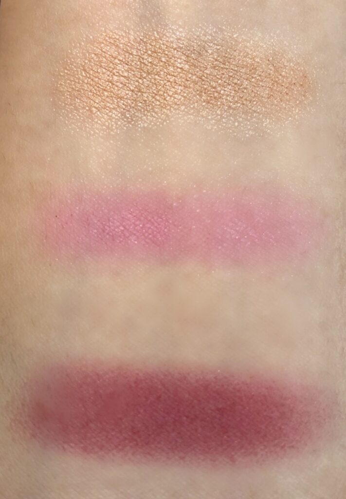 アイシャドウはこちらの3色・・・発色がかなり良いです!今回は9色の中でもハッキリとした発色の物をチョイスしました。(ルミナイザーによる下地を使用していなくてこの発色)