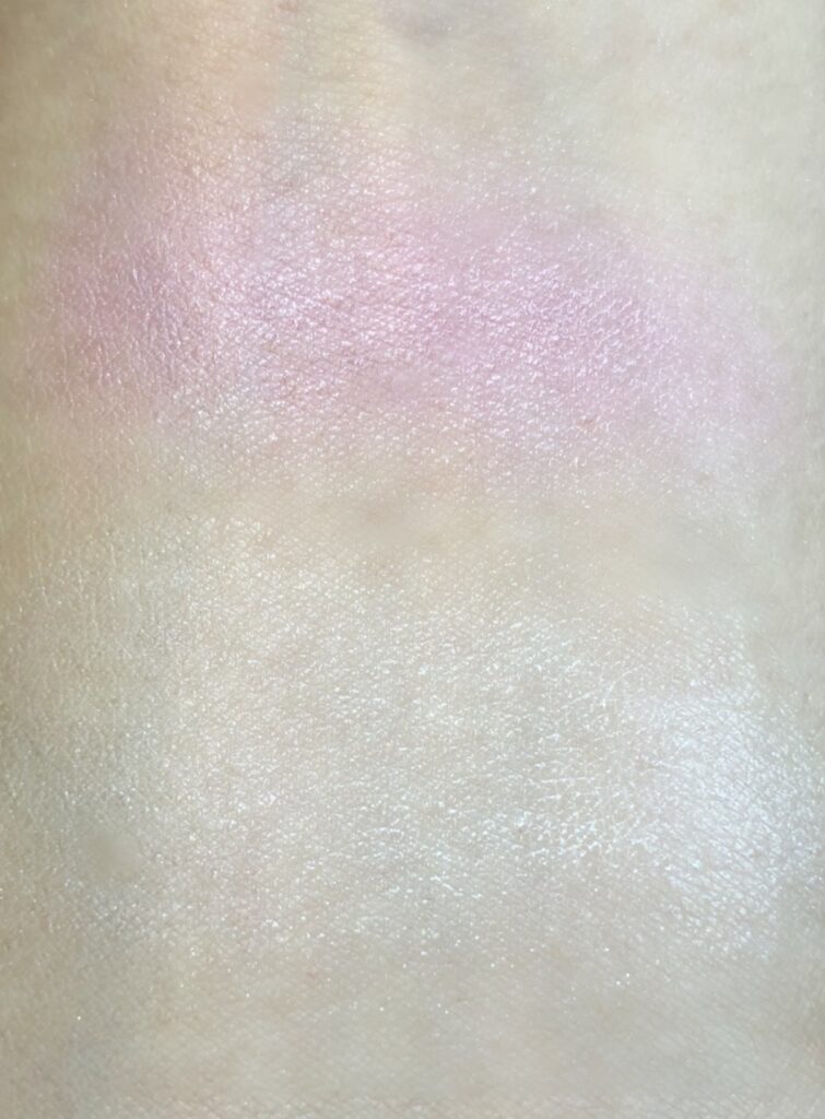 お次はチークとルミナイザーです。画像でわかる様にギラギラしない細かいパールが入っています。こちらは両方ともクリームタイプなのでパウダータイプより浮かずに自然な艶肌っぽい仕上がりで綺麗です。チークは薄付きなので重ねて自分好みの濃さにしてください。