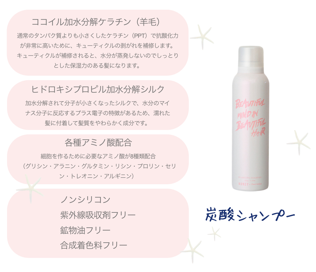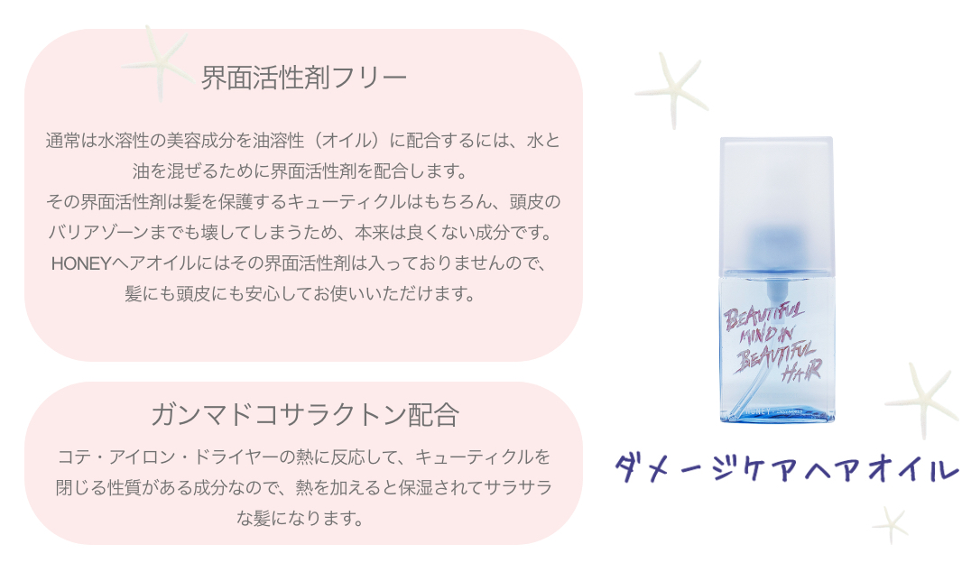 通常は水溶性の美容成分を油溶性(オイル)に配合するには、水と油を混ぜるために界面活性剤を配合します。 その界面活性剤は髪を保護するキューティクルはもちろん、頭皮のバリアゾーンまでも壊してしまうため、本来は良くない成分です。 HONEYヘアオイルにはその界面活性剤は入っておりませんので、髪にも頭皮にも安心してお使いいただけます。