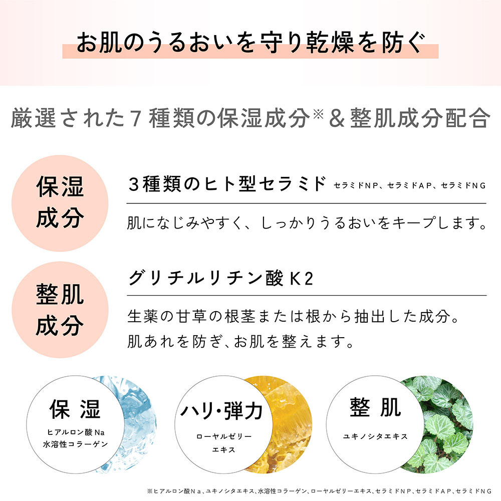 水、BG、シクロペンタシロキサン、酸化亜鉛、酸化チタン、ステアリン酸ソルビタン、ネオペンタン酸イソステアリル、イソステアリン酸PEG−60グリセリル、PEG−9ジメチコン、含水シリカ、グリセリン、グリチルリチン酸2K、ヒアルロン酸Na、ユキノシタエキス、水溶性コラーゲン、ローヤルゼリーエキス、セラミドNP、セラミドAP、セラミドNG、シリカ、ハイドロゲンジメチコン、ジメチコン、トリメチルシロキシケイ酸、フェノキシエタノール、ベヘニルアルコール、(アクリル酸Na/アクリロイルジメチルタウリンNa)コポリマー、イソヘキサデカン、ヤシ脂肪酸スクロース、ポリソルベート80、(PEG−240/デシルテトラデセス−20/HDI)コポリマー、トコフェロール、ニオイテンジクアオイ油、リン酸アスコルビルMg、水添レシチン、フィトステロールズ、キサンタンガム