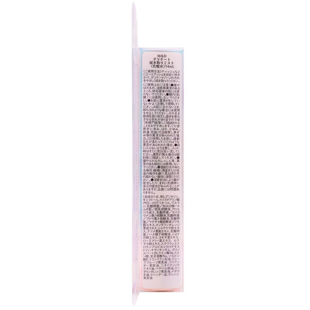 水、BG、グリセリン、キシリトール、イソステアリン酸PEG−20グリセリル、プルラン、乳酸桿菌/加水分解ハトムギ胚/胚乳発酵液、アロエベラ液汁、乳酸桿菌/セイヨウナシ果汁発酵液、乳酸桿菌/ブドウ果汁発酵液、乳酸桿菌/マテチャ葉発酵液、トウキ根エキス、マンダリンオレンジ果皮エキス、シャクヤク根エキス、ナツメ果実エキス、乳酸桿菌/ハス種子発酵液、ショウガ根エキス、ヨモギ葉エキス、ローズマリー葉エキス、ムラサキ根エキス、スクワラン、ヒドロキシプロピルシクロデキストリン、キサンタンガム、ポリソルベート20、クエン酸Na、クエン酸、安息香酸Na、ソルビン酸K、イランイラン花油、グレープフルーツ果皮油、コリアンダー果実油、ニオイテンジクアオイ油、ベチベル根油、マンダリンオレンジ果皮油、メボウキ油、ラベンダー油、オレンジ果皮油
