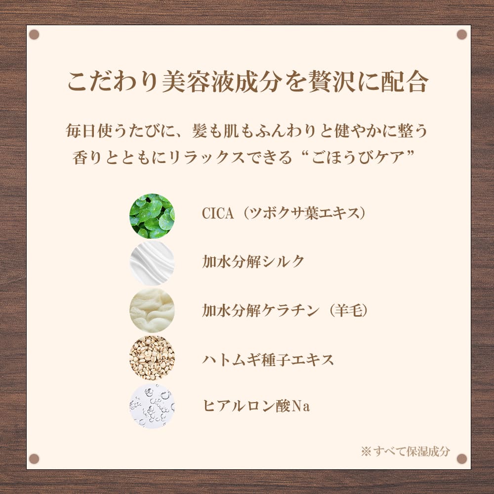 水、エタノール、PEG-40水添ヒマシ油、ペンチレングリコール、BG、加水分解ケラチン(羊毛)、ハトムギ種子エキス、ツボクサ葉エキス、加水分解シルク、ヒアルロン酸Na、クエン酸Na、クエン酸、香料、フェノキシエタノール