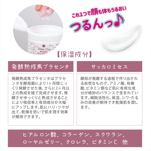 水、グリセリン、PEG−25水添ヒマシ油、サッカロミセス/(黒砂糖/プラセンタエキス)発酵液、サッカロミセス/ムレスズメ根発酵エキス、クロレラエキス、ローヤルゼリーエキス、ヒアルロン酸Na、プラセンタエキス、サクシノイルアテロコラーゲン、スクワラン、アスコルビルリン酸Na、ハトムギ種子エキス、アロエベラ葉エキス、グレープフルーツ果実エキス、サンザシエキス、ナツメ果実エキス、リンゴ果実エキス、アルニカ花エキス、セイヨウオトギリソウ花/葉/茎エキス、セイヨウキズタ葉/茎エキス、セイヨウトチノキ種子エキス、ハマメリス葉エキス、ブドウ葉エキス、ライム果汁、オレンジ果汁、レモン果汁、メチルグルセス-10、、トリ(カプリル酸/カプリン酸)グリセリル、カルボマー、ジイソステアリン酸ポリグリセリル-2、水酸化K、アミノカプロン酸、ペンチレングリコール、BG、クエン酸Na、フェノキシエタノール、ヒドロキシプロピルシクロデキストリン、ブチルカルバミン酸ヨウ化プロピニル